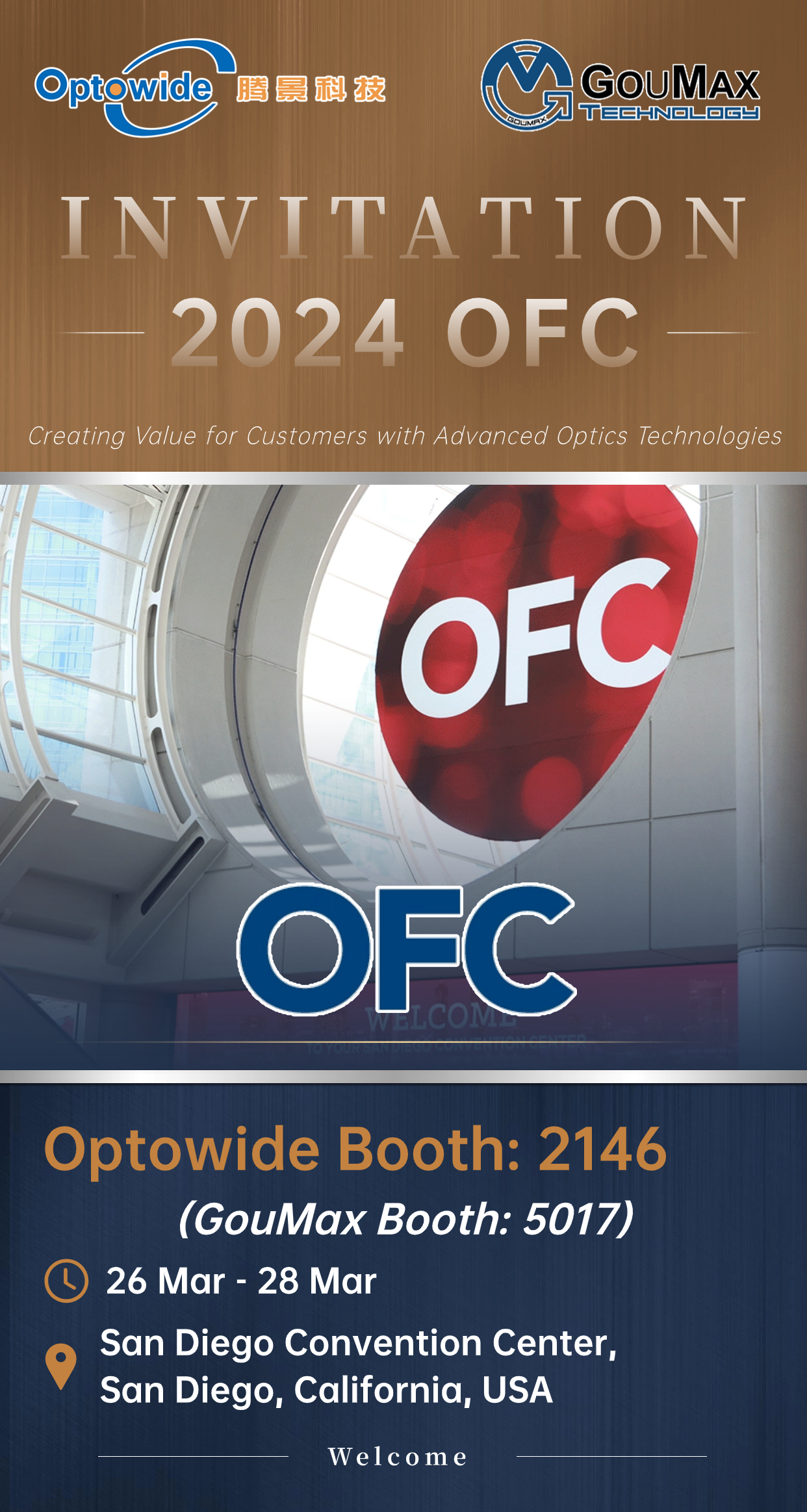 尊龙凯时·(中国)网站-AG旗舰厅科技将参加3月26日-3月28日在美国圣地亚哥举办的2024年OFC-光网络与通信研讨会及博览会。尊龙凯时·(中国)网站-AG旗舰厅科技展位号:2146,腾景科技控股子公司GouMax也将参展,展位号:5017。期待您的光临!