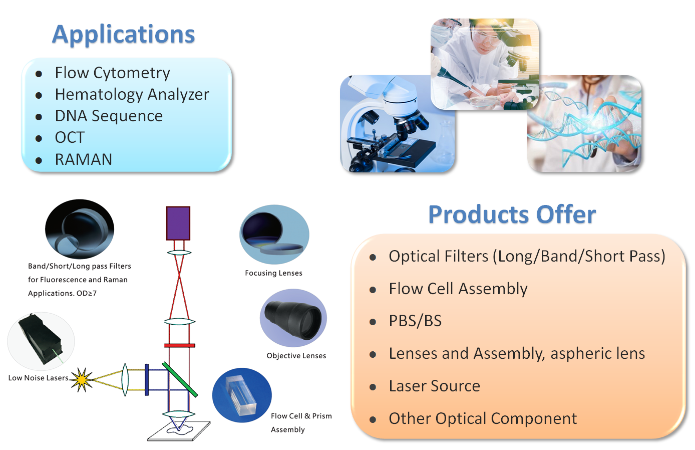 公司能提供各类光学元器件,如光学滤光片(长波通/短波通/带通)、偏振分束器,以及各类透镜、装配件等。可应用于内窥镜系统、流式细胞仪、DNA测序仪、拉曼光谱仪等生物医疗器械和设备。
