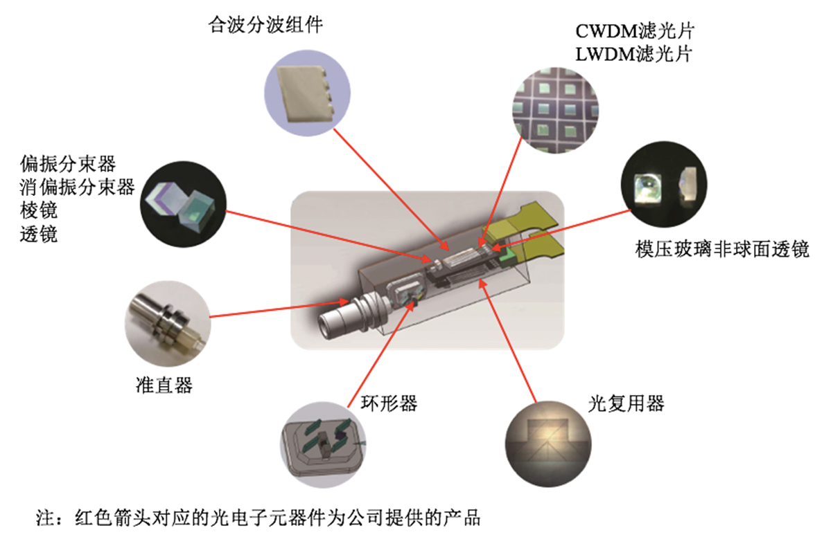 公司可以提供收发光模块中使用的各种光学元件、光纤器件,其主要构成包括滤光片、偏振分束器、非偏振分束器、棱镜、透镜、非球面透镜等各类光学元件,以及环形器、准直器、合波分波组件、光复用器等光纤器件。
